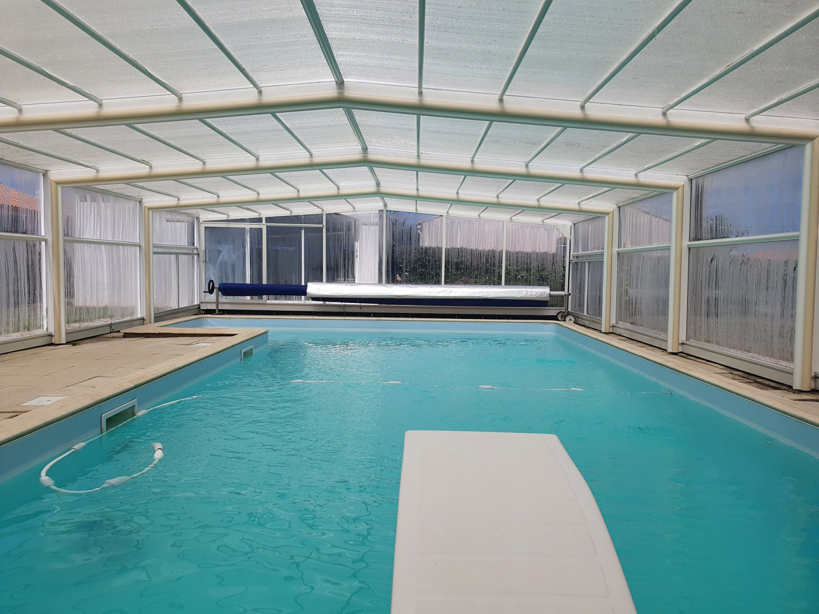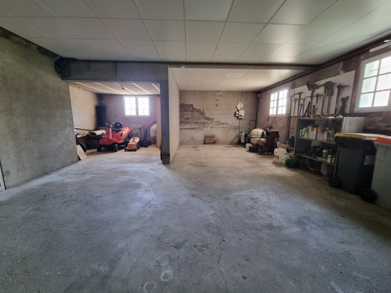 en rez de chaussée, garage double, atelier, une pièce aménagée et chaufferie. piscine couverte avec pool house. chauffage central gaz de ville.