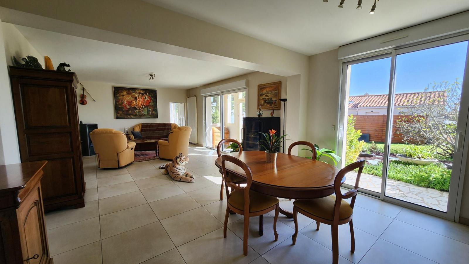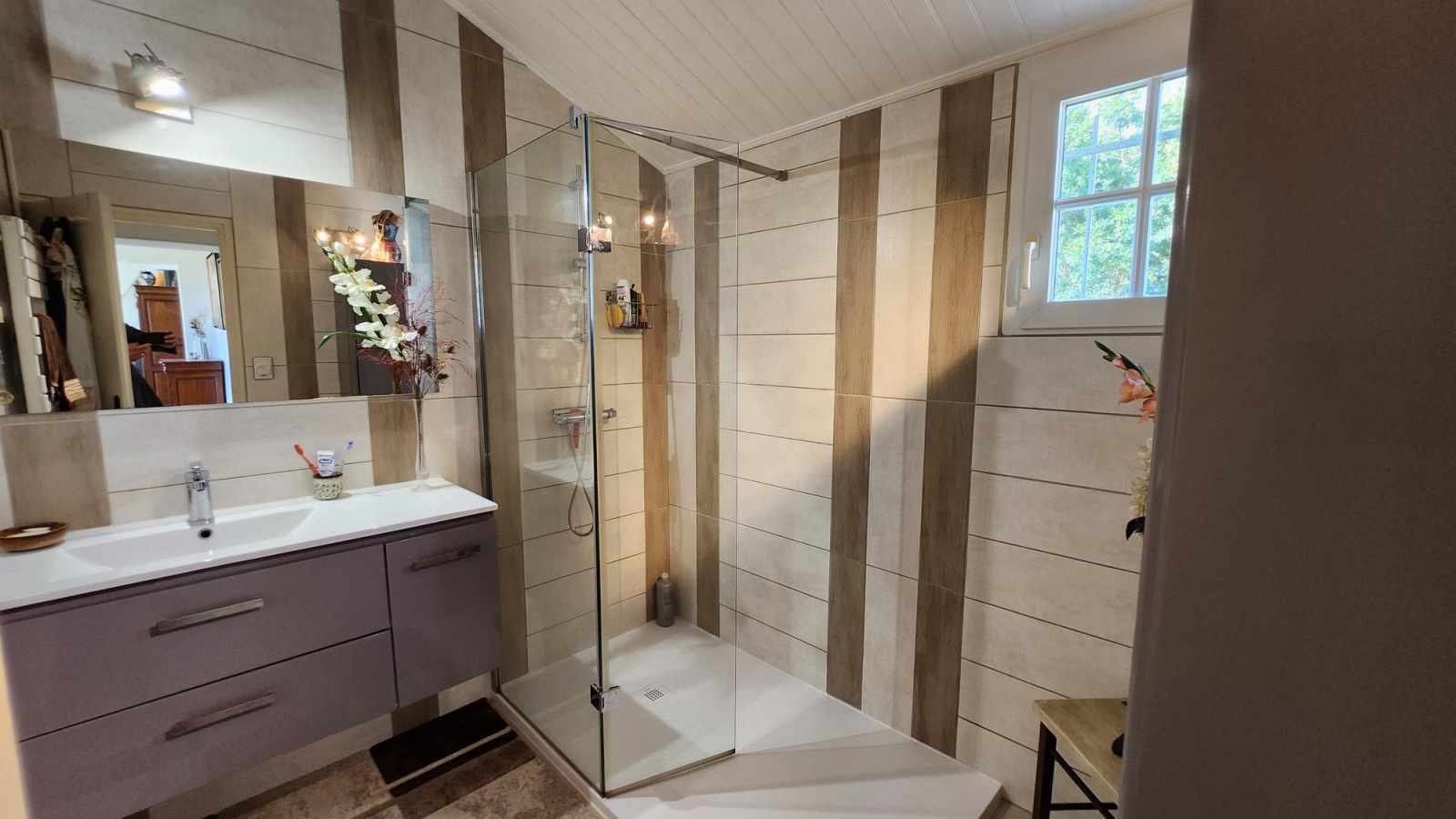 l'habitation principale de 126 m² se compose d'un vaste séjour salon avec poële à pellets, bow window, deux vastes chambres, deux salles d'eau, cuisine équipée